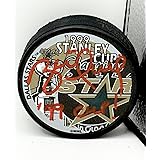 A blue jacket holding a hockey stick and wearing a union jacket. A wordmark "COLUMBUS BLUE JACKETS" in white with red trim.