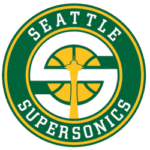 The final Sonics logo is a white colored "S" representing Seattle and Sonics written on a yellow basketball. The "S" is shaped to be circular so that it covers the ball. The logos is written on a green background which represents the team colors. On top is wordmark "SEATTLE" in white and "SONICS" in yellow with a green line throughout.