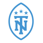 A football on its tip with three arched stars and an interlocked lettering "TN" in light blue.